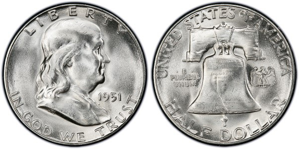 Franklin half dollars were produced from 1948-1963. They are commonly found in junk silver in circulated condition, but higher grades from the 1960s are fairly common as well.