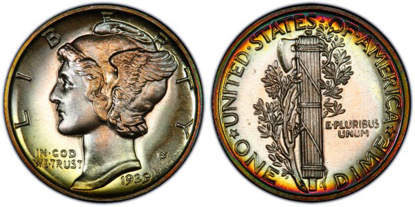 Mercury dimes, sometimes called Winged Liberty dimes, were produced from 1916-1945. Dates from the 1940’s are more common and are often in less worn condition than earlier dates.